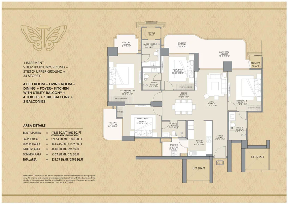 Project has premium 3 BHK and 4 BHK units. These 3 BHK units are around 1910 sq. feet. The 4 BHK units measure 2495 sq. feet. The apartments are built with big balcony and high ceilings.